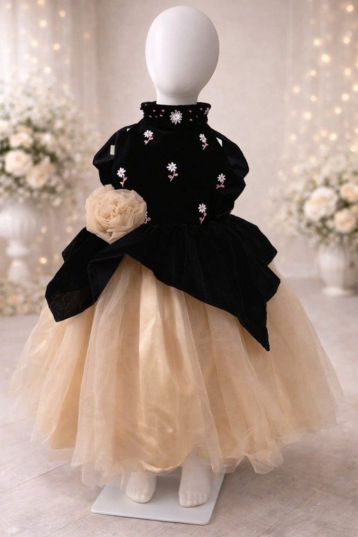 A charming party-wear frock featuring a black embroidered bodice with delicate floral details, paired with a soft beige layered tulle skirt. The asymmetrical overlay and fabric flower accent add a graceful, elegant touch—perfect for special occasions and celebrations