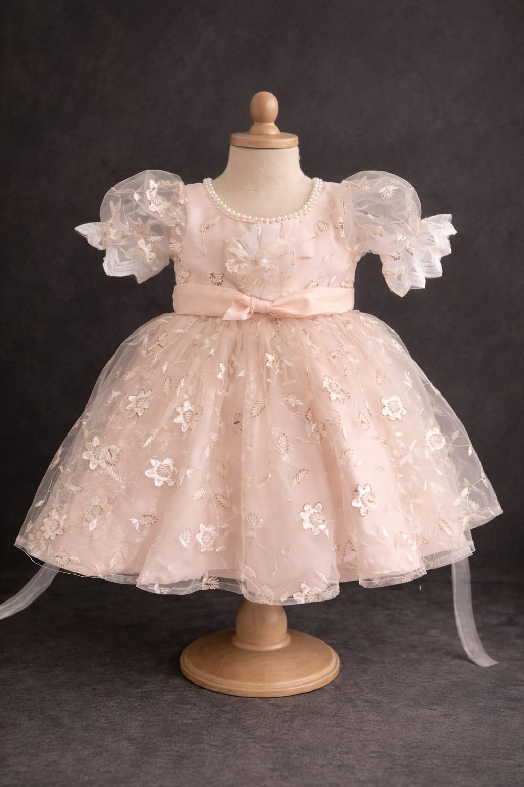 This frock is an elegant, princess-style dress in a soft blush-peach tone, designed with delicate and luxurious details. The bodice features fine floral embroidery with subtle threadwork that adds texture and charm. A rounded neckline is beautifully accented with a trim of small pearls, giving it a graceful and refined finish.