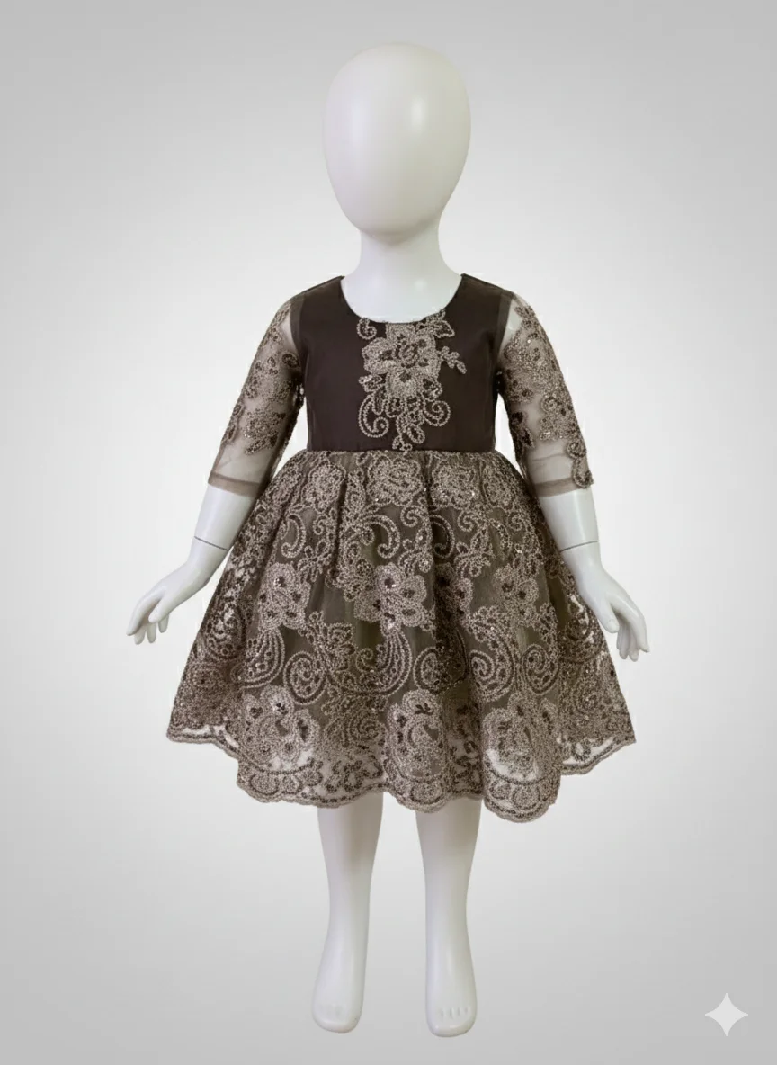 This refined frock features intricate floral lace throughout with sheer long sleeves and a subtle lace overlay on the bodice, creating a delicate, grown-up look. The round neckline and pleated A-line skirt add classic elegance, while the neutral taupe shade pairs beautifully with any accessories or jewelry. Ideal for weddings, family functions, and special occasions where a timeless, sophisticated style shines.